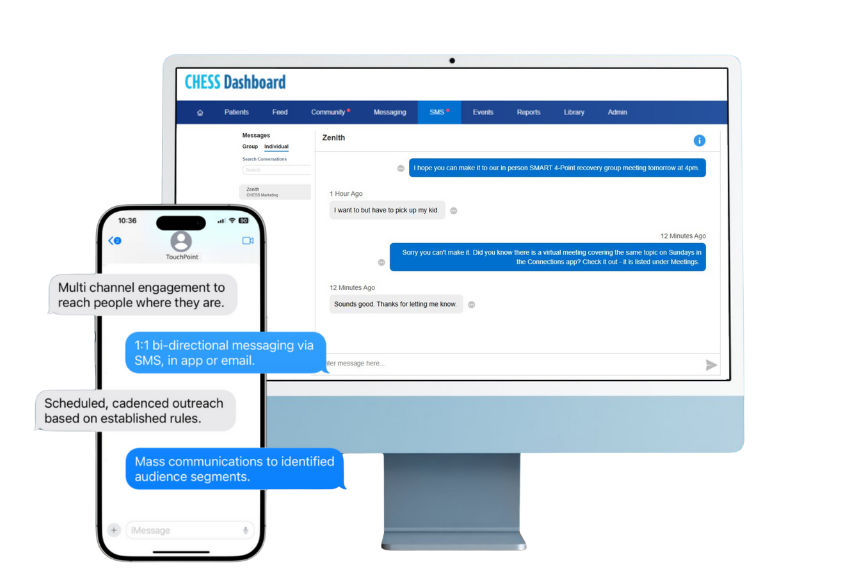 TouchPoint is a multi-channel engagement tool that enables seamless communication with patients, members, and alumni through SMS, email, and in-app messaging. Part of the eRecovery Solution, TouchPoint goes beyond basic communication to foster meaningful connections through intelligent messaging, surveying tools, and automated outreach that drives real engagement results.