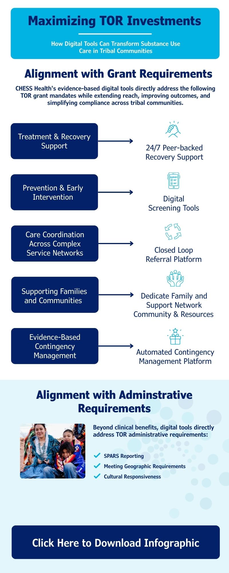 CHESS Health’s suite of digital tools directly address TOR grant mandates while extending reach, improving outcomes, and simplifying compliance across tribal communities. From 24/7 peer support to automated contingency management, our platform helps maximize TOR investments for long-term, sustainable impact. By integrating digital support tools into existing programs, Tribal organizations can extend their reach, improve outcomes, and ensure that TOR investments drive long‑term, sustainable impact.