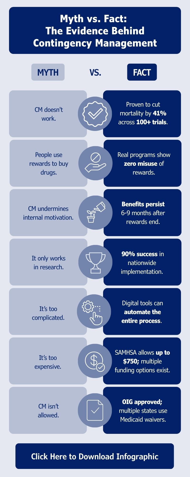 This infographic distills the most persistent myths and contrasts them with the actual evidence – including CM’s proven impact on engagement, retention, and mortality. It gives leaders a fast way to understand the science and cut through confusion.